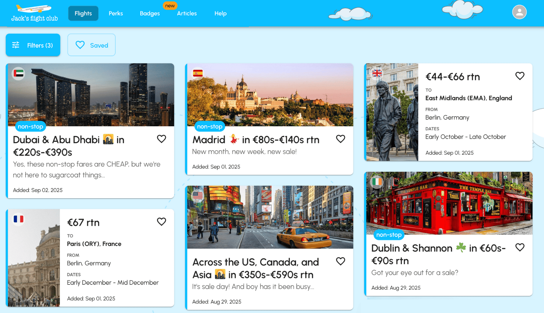 My favorite tip for finding cheap flights has nothing to do with search engines: the best flight deals I’ve ever found were in newsletters that track them, like Jack’s Flight Club, Secret Flying, or Fly4free. You tell them your preferred departure airport (and optionally some destinations you’re interested in), and you get an email or a push notification every time there’s a deal that matches your criteria. Thanks to these, I’ve flown to Tokyo for €450 round trip and New York for under €300. If your dates are flexible, this is by far the best way to find a bargain. Most of these services have free and premium tiers (they reserve some of the deals for premium members only). I stick with the free plans most of the time, but Jack’s Flight Club often does promos for €1 or even €0 for a few months – if I see one, I jump on it.