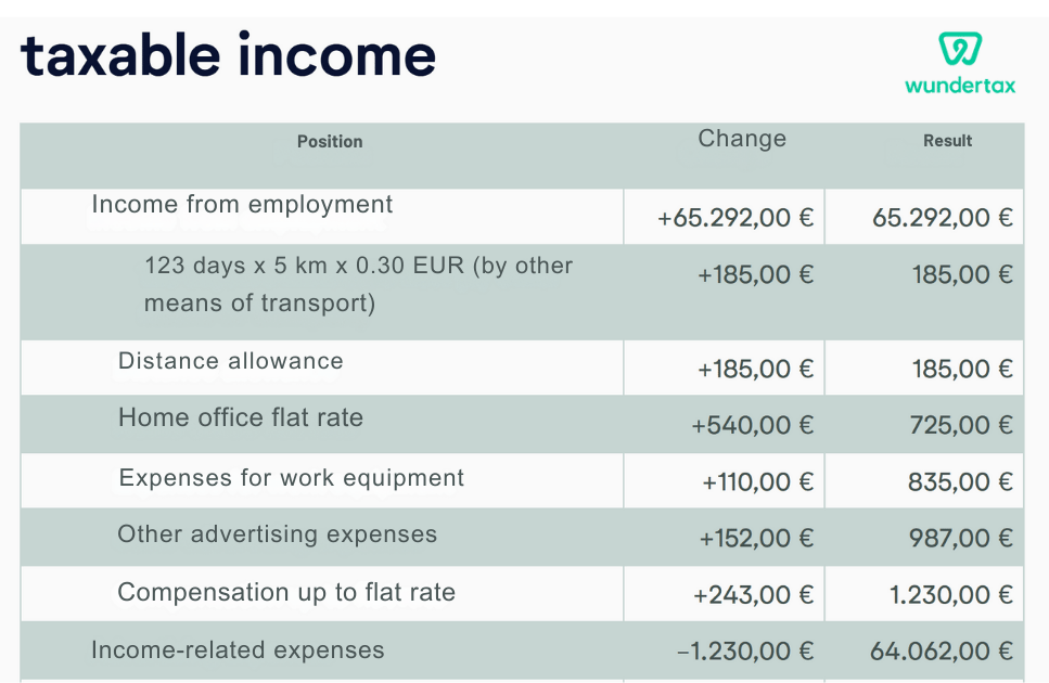 By default, every employee gets a flat rate of €1,230 for income-related expenses as a tax deduction in Germany — no proof needed. But if your actual costs were higher, you can list them individually and claim the full amount. If you're using tax software like Wundertax, you don’t need to worry about comparing the two — just enter your costs, and the tool will automatically apply whichever option gives you the better refund. If you’re self-employed, the flat rate doesn’t apply to you – in this case, you can only claim your actual expenses to get your German tax refund.
